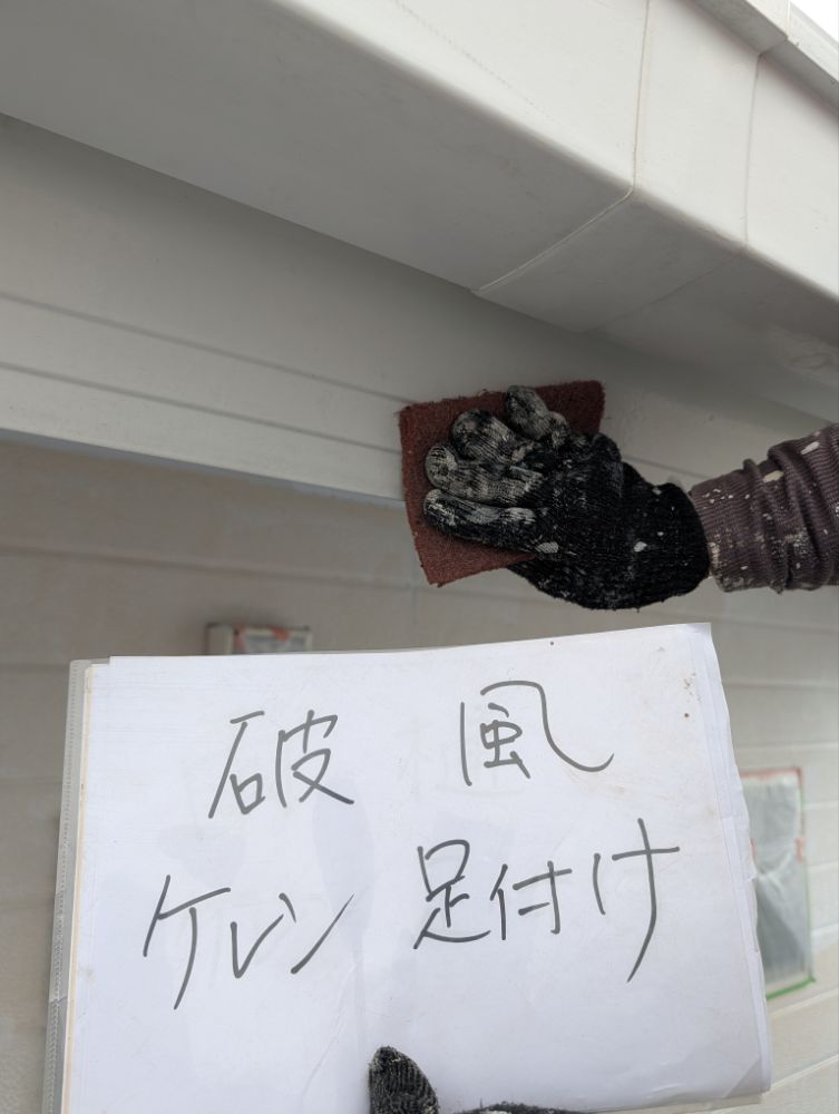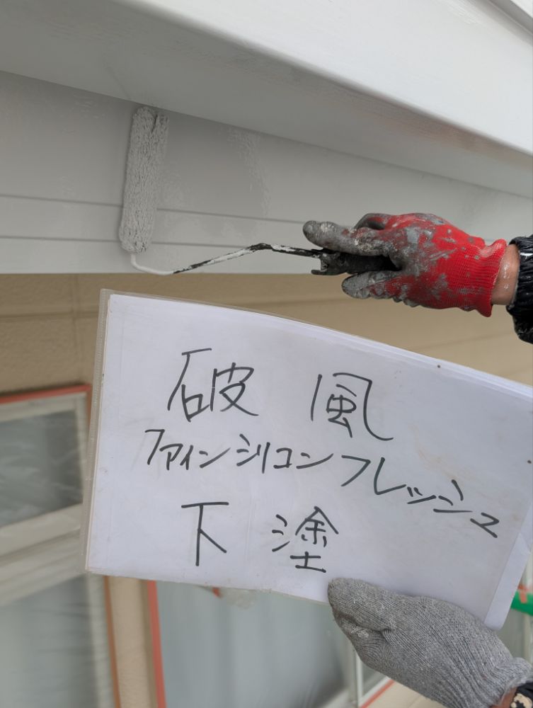 破風を2液のファインシリコンフレッシュで下塗り塗装をしています。