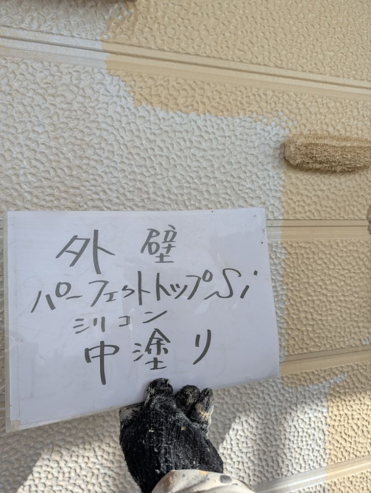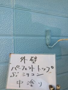 外壁をパーフェクトトップSiシリコンで中塗り塗装をしています
