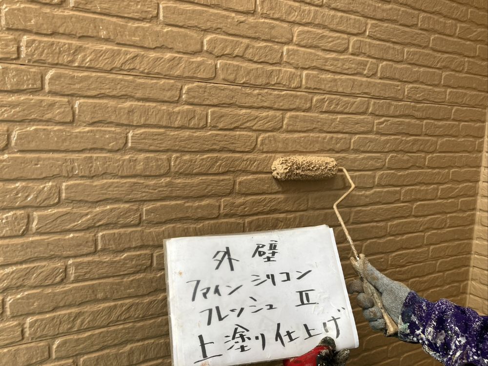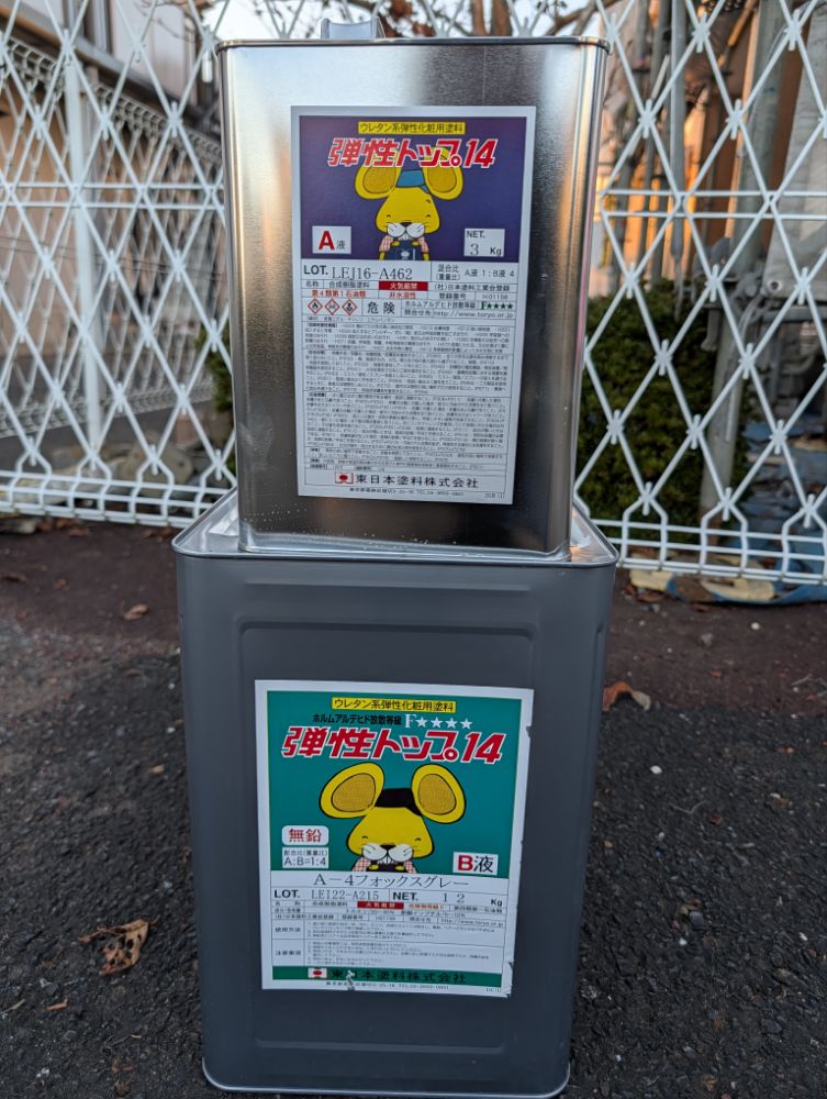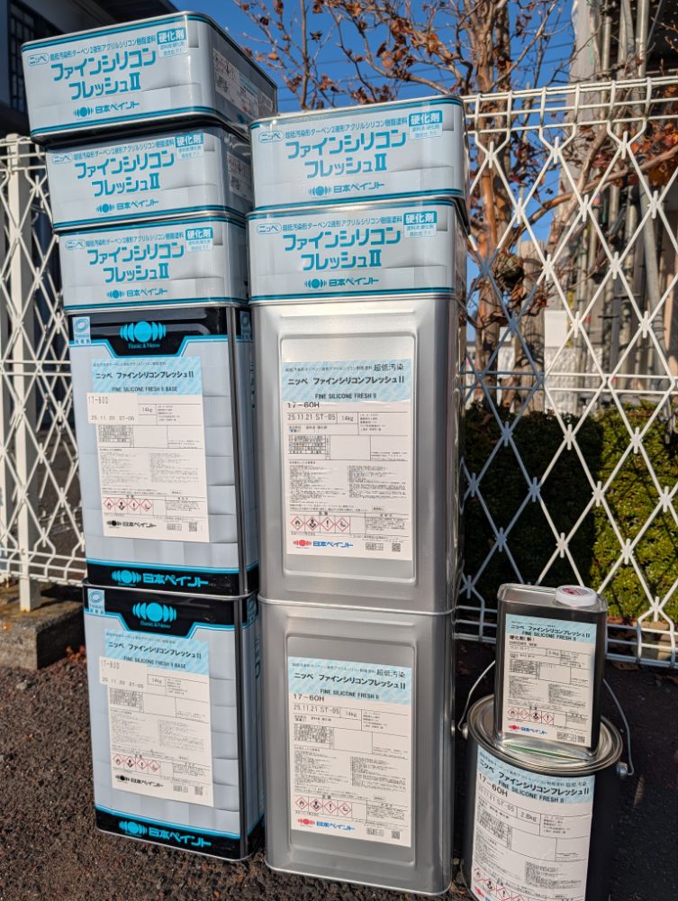 続いて、中塗り塗装と上塗り仕上げ塗装を行います。2液のファインシリコンフレッシュ2を使います。